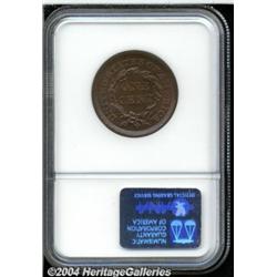 <table><tr><td><table><tr><td>1855 1C Upright 5s MS66 Red and Brown NGC. N-3, R.1. Die lines through RT in LIBERTY aid attribution. Bright orange color outlines the date, denomination, and devices, with lavender patina throughout the fields and portrait. A well preserved premium Gem that is boldly struck aside from the upper obverse border. <BR><BR><B>Important notice:</B> Heritage usually auctions material at the rate of 200-250 lots per hour. On some occasions eBay Live bid software or the Internet may not be able to keep up with the pace of the auction. We recommend placing a realistic absentee bid now as insurance to avoid disappointment. Occasionally the auctioneer may eliminate or reject an eBay Live bid, and the auctioneer may also reopen a lot after the close of the eBay live bidding (usually because we missed an audience bid), and may reject your bid even if it shows you as the winning bidder. By bidding via eBay Live, you agree that Heritage may award the lot to another bidder at its sole discretion under the circumstances described above or any other reasonable circumstances. Since eBay bids are not shown to us until we open the lot on the floor, we treat those bids just like floor bids. In most cases the floor responds before the eBay bid is presented to us, due to Internet lag time, so for consistency we have made it a policy that floor bids are always considered first over tie eBay live bids. Also please note that all Heritage lots purchased through eBay Live carry a 20% Buyer's Premium. Please make sure you read the Terms and Conditions before you bid. <BR><BR><B>IMPORTANT ANNOUNCEMENT ABOUT RESERVES:</B> Heritage now divulges all reserves on its web site 7 days before every auction. If you want to know whether the reserve on this lot has been met, and if not, what the reserve amount is, please visit this lot page on the HeritageCoin.com web site, or email: bid@HeritageGalleries.com </span></font></td></tr></table></td></tr></table>
