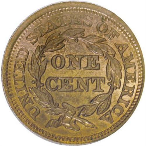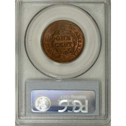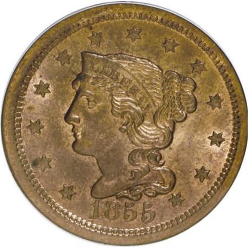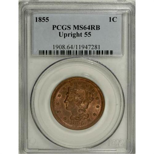 <B>1855 1C Upright 5s MS64 Red and Brown PCGS.</B></I> PCGS Population (153/65). NGC Census: (82/124). Mintage: 1,574,829. Numismedia Wsl. Price for NGC/PCGS coin in MS64: $392. (#1908)<BR><BR><B>Coin Engraver:</B> Christian Gobrecht<BR><BR><b>Shipping:</b> Coins & Currency (<a target="_blank" href="http://www.heritageauctions.com/common/shipping.php">view shipping information</a>)