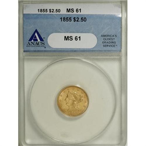<B>1855 $2 1/2 MS61 ANACS.</B></I> NGC Census: (64/100). PCGS Population (8/78). Mintage: 235,480. Numismedia Wsl. Price for NGC/PCGS coin in MS61: $380. (#7774)<BR><BR><B>Coin Engraver:</B> Christian Gobrecht<BR><BR><b>Shipping:</b> Coins & Currency (<a target="_blank" href="http://www.heritageauctions.com/common/shipping.php">view shipping information</a>)