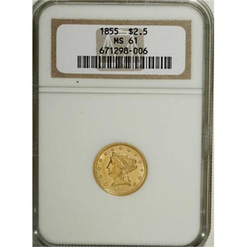 <B>1855 $2 1/2 MS61 NGC.</B></I> NGC Census: (64/98). PCGS Population (8/78). Mintage: 235,480. Numismedia Wsl. Price for NGC/PCGS coin in MS61: $400. (#7774)<BR><BR><B>Coin Engraver:</B> Christian Gobrecht<BR><BR><b>Shipping:</b> Coins & Currency (<a target="_blank" href="http://www.heritageauctions.com/common/shipping.php">view shipping information</a>)