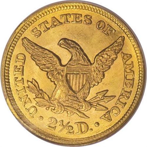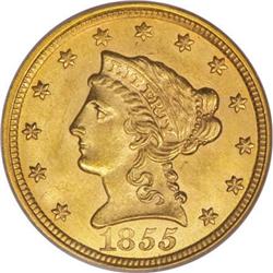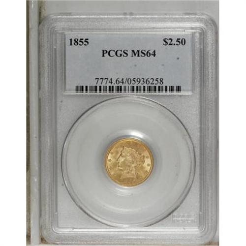 <B>1855 $2 1/2 MS64 PCGS.</B></I> While relatively available in the lower grades of Uncirculated (for a quarter eagle from the 1850s), the availability of the 1855 thins out noticeably at the MS64 level. This is a lovely coin and one that strongly suggests a full MS65 grade. The surfaces are softly frosted and there are no reportable abrasions on either side. The obverse is several shades lighter in hue than the reverse, which has a pronounced reddish color. Slightly misaligned dies cause a needle-sharp strike on the lower obverse and upper reverse, while the remainder of the piece displays minor softness. Population: 10 in 64, 6 finer (6/07).<BR><BR><B>Coin Engraver:</B> Christian Gobrecht<BR><BR><b>Shipping:</b> Coins & Currency (<a target="_blank" href="http://www.heritageauctions.com/common/shipping.php">view shipping information</a>\)