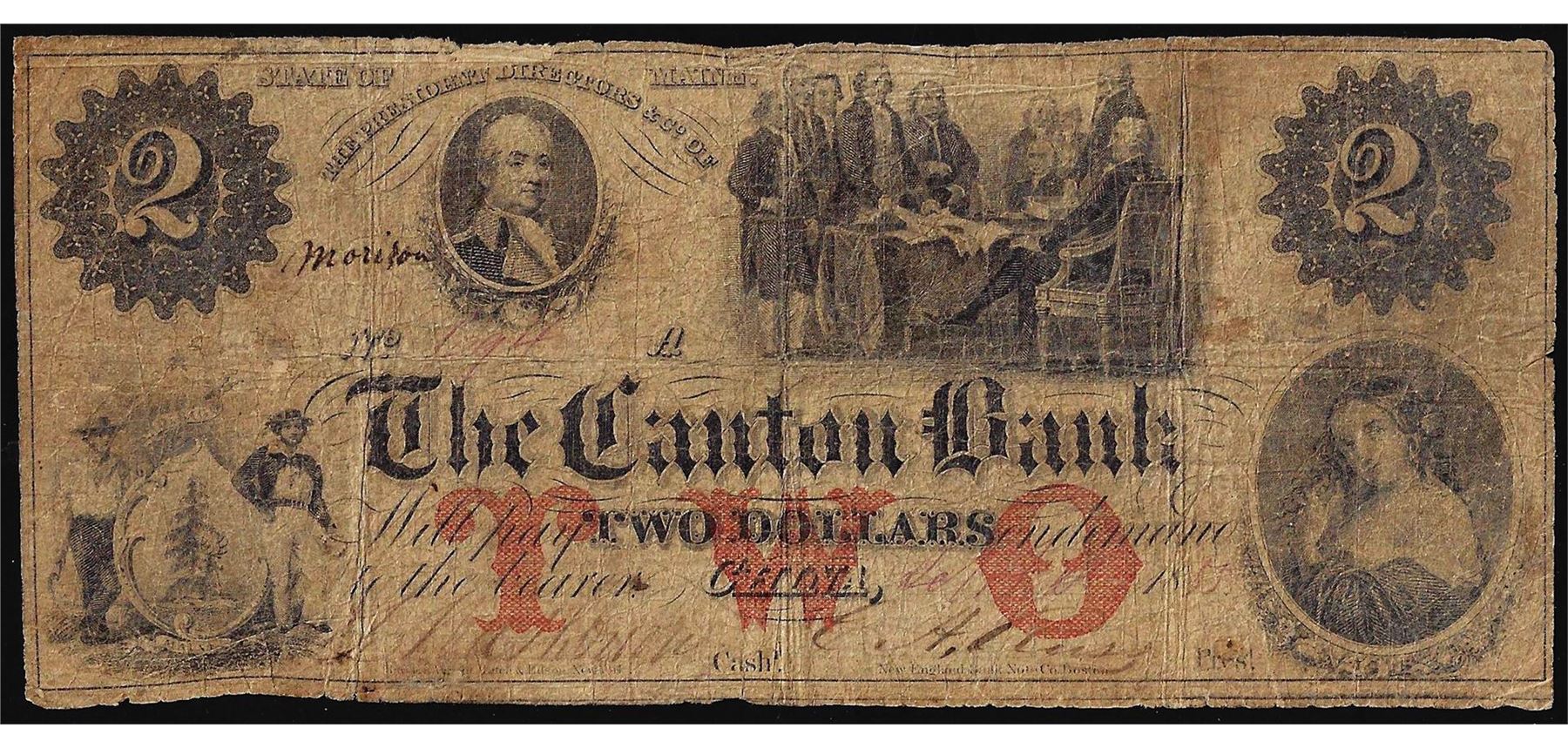One 1855 $2 The Canton Bank China, ME Obsolete Banknote.