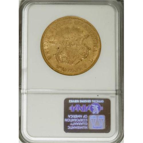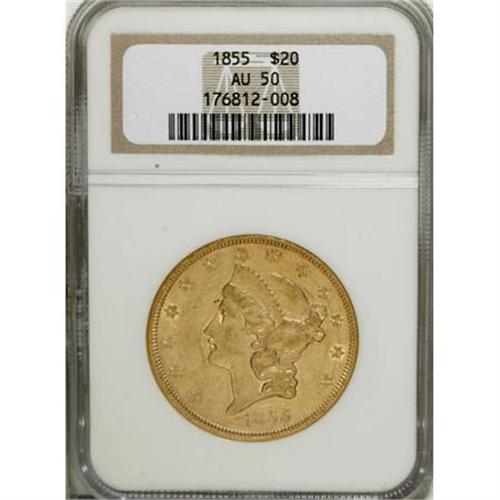 <B>1855 $20 AU50 NGC.</B></I> A conditionally rare issue that mostly missed the various shipwreck hoards, although the <I>S.S. Republic</B></I> had a few. Stars 8 to 13 are connected by a series of hair-thin pinscratches, which are also faintly present near the right (facing) wingtip and the 8 in the date. Struck from clashed dies.<BR><BR><B>Coin Engraver:</B> James B. Longacre<BR><BR><b>Shipping:</b> Coins & Currency (<a target="_blank" href="http://www.heritageauctions.com/common/shipping.php">view shipping information</a>)
