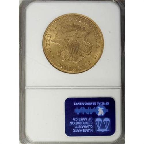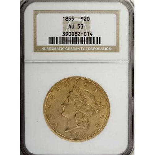 <B>1855 $20 AU53 NGC.</B></I> A clean coin with nice, green-gold surfaces. The luster that remains is satiny rather than brilliant. While typically available in VF or XF, this date becomes a fairly desirable rarity at the AU or higher level.<BR><BR><B>Coin Engraver:</B> James B. Longacre<BR><BR><b>Shipping:</b> Coins & Currency (<a target="_blank" href="http://www.heritageauctions.com/common/shipping.php">view shipping information</a>)