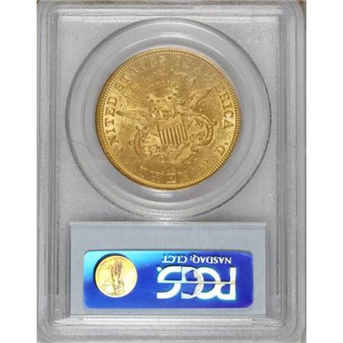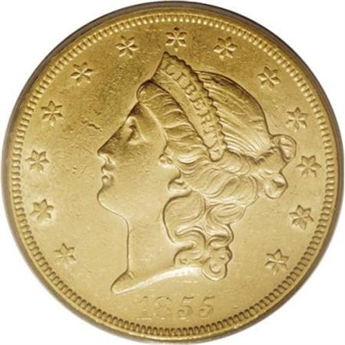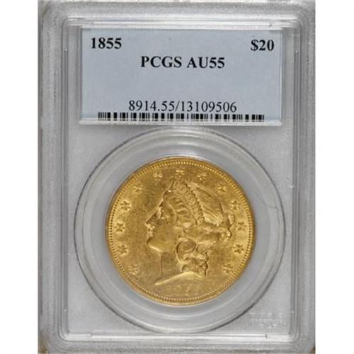 <B>1855 $20 AU55 PCGS.</B></I> Mintages of double eagles at Philadelphia dropped annually between 1851 and 1856, since an increasing quantity of California-mined gold was struck by the U.S. Assay Office or the fledgling San Francisco Mint. This partly lustrous representative has distributed small marks but is free from heavy abrasions.<BR><BR><b>Shipping:</b> Coins & Currency (<a target="_blank" href="http://www.heritageauctions.com/common/shipping.php">view shipping information</a>)