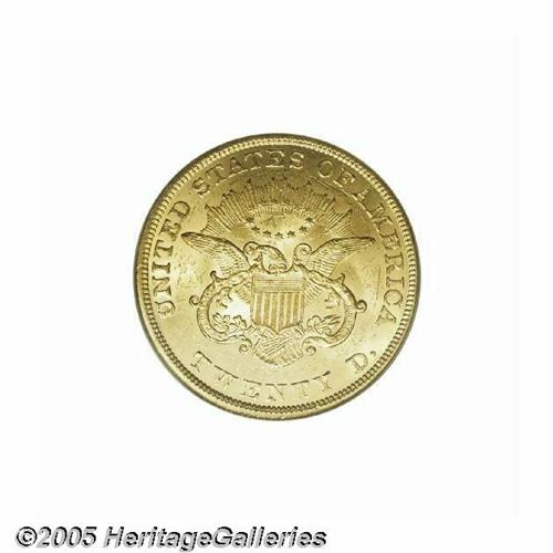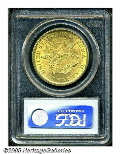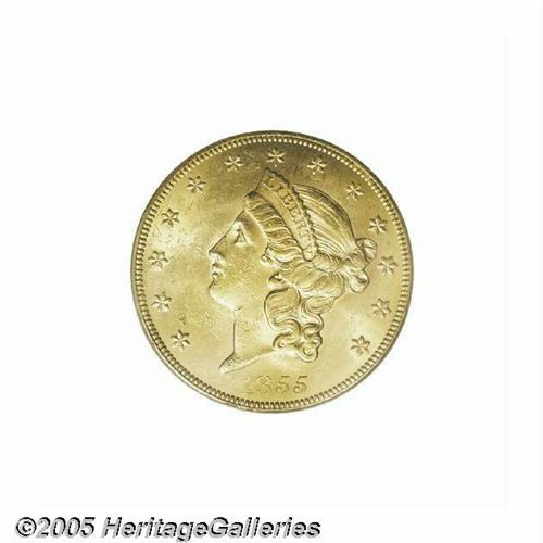 <B>1855<$20> MS62 PCGS.</B></I> An unusually bright example of this early double eagle. Untoned and struck in a light orange-gold color. Any Type One issue, other than perhaps the 1861, is a significant coin in strict Mint State, and generally tops out near the MS62 grade. The 1855, however, is an unusually elusive issue in high grades, with most surviving specimens only grading VF or XF. This is one of the ten finest known examples, being firmly struck with complete mint frost in the fields and over all the devices. The color is uniform, and surface blemishes are numerous, but mostly superficial. Population: 3 in 62, 2 finer (6/05).