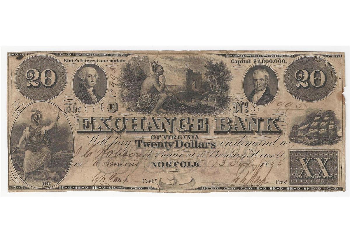 1855 $20 The Exchange Bank of Virginia Obsolete ERROR Gutterfold Note