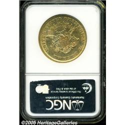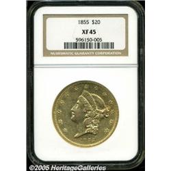 <B>1855 $20 XF45 NGC.</B></I> Hints of peach and lilac color overlay the lightly marked pale gold surfaces. Luster surrounds the stars, legends, and rays. Philadelphia Mint production was smaller in 1855 than in previous years, since the San Francisco Mint could now coin west coast bullion.