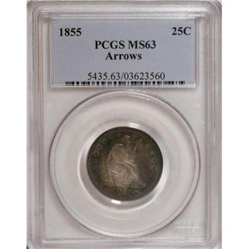 <B>1855 25C Arrows MS63 PCGS.</B></I> Medium intensity aquamarine and gold toning in the fields highlights lighter toned motifs. Design weakness is noted on most of the star centers and in the central portion of the reverse device. Nicely preserved surfaces are devoid of significant abrasions. Population: 20 in 63, 15 finer (1/08).<BR><BR><B>Coin Engraver:</B> Christian Gobrecht<BR><BR><b>Shipping:</b> Coins & Currency (<a target="_blank" href="http://www.heritageauctions.com/common/shipping.php">view shipping information</a>)