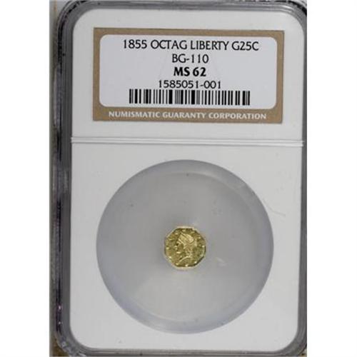 <B>1855 25C Liberty Octagonal 25 Cents, BG-110, High R.4, MS62 NGC.</B></I> NGC Census: (3/3). PCGS Population (29/39). (#10379)<BR><BR><b>Shipping:</b> Coins & Currency (<a target="_blank" href="http://www.heritageauctions.com/common/shipping.php">view shipping information</a>)