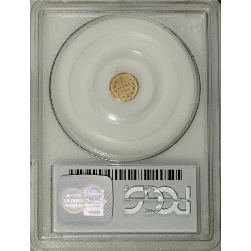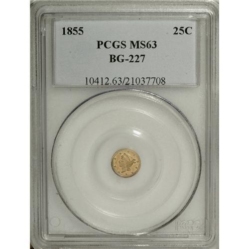 <B>1855 25C Liberty Round 25 Cents, BG-226A, R.5, MS63 PCGS.</B></I> Listed on the PCGS insert (and in the first edition of Breen-Gillio) as BG-227, but reclassified as BG-226A in the second edition of the standard reference. Eight pearls on coronet. An attractive dusky apricot-gold piece with a slightly wavy reverse field, as made.<BR><I>Ex: Virgil Brand Collection (Bowers and Merena, 11/83), lot 643; Thomas Young Collection (Heritage, 2/02), lot 7168.</B></I><BR><BR><b>Shipping:</b> Coins & Currency (<a target="_blank" href="http://www.heritageauctions.com/common/shipping.php">view shipping information</a>)