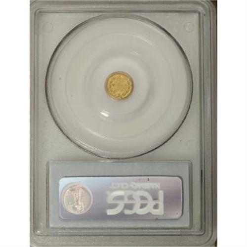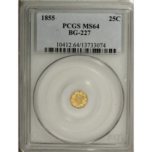 <B>1855 25C Liberty Round 25 Cents, BG-227, R.6, MS64 PCGS.</B></I> This is a bright orange-gold and semi-prooflike piece, well-struck for a Fractional with weakness visible only in the denomination. A couple of small abrasions in the right obverse field appear to limit the grade. The major grading services have combined to certify only two examples of BG-227 finer (11/07). <BR><BR><b>Shipping:</b> Coins & Currency (<a target="_blank" href="http://www.heritageauctions.com/common/shipping.php">view shipping information</a>)