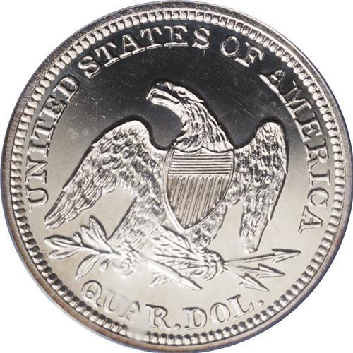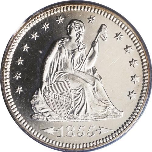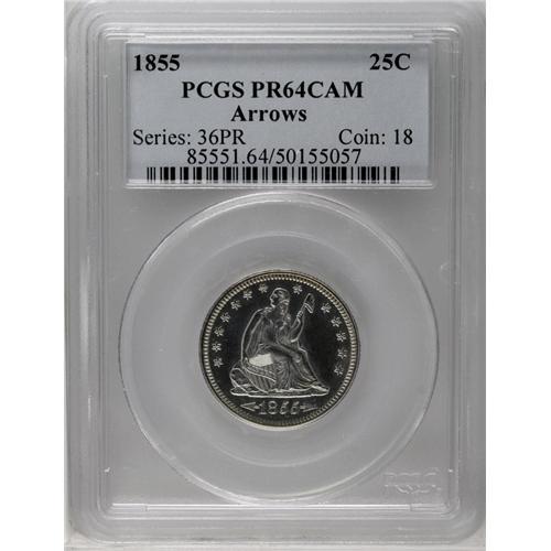 <B>1855<25C> PR64 Cameo PCGS.</B></I> The 1854 and 1855 quarter dollars with arrows by the date are common, but proofs are highly-prized rarities. PCGS has certified a total of eight pieces in all grades, and resubmissions are possible given its two decades of operation. This brilliant proof is sharply struck, with essentially full detail on both sides. Only the two lowest stars at the right are lacking any detail, and even these have their radial lines. A few vertical striations are visible on both sides, mostly near the peripheries. A couple of trivial lintmarks are visible on both sides, especially in the obverse field. The devices are dramatically frosted, and exhibit exceptional contrast with the mirrored fields.