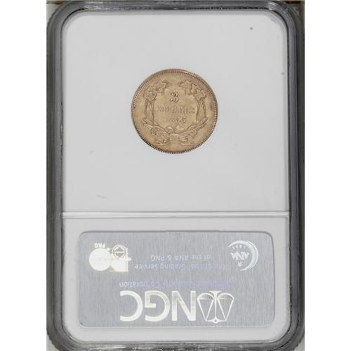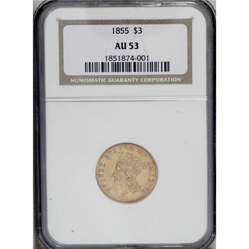 1855 $3 AU53 NGC. Vestiges of original luster appear o