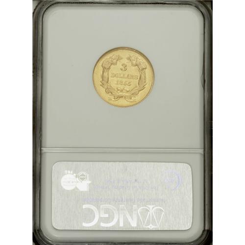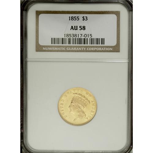 <B>1855 $3 AU58 NGC.</B></I> Pale greenish-gold fields contrast with the yellow-gold devices, which display light friction. A selection of shallow abrasions is noted in the obverse fields.<BR><BR><b>Shipping:</b> Coin/Currency (<a target="_blank" href="http://www.heritageauctions.com/common/shipping.php">view shipping information</a>)