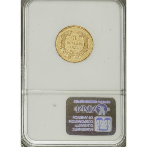<B>1855 $3 AU58 NGC.</B></I> This denomination proved unessential to commerce, and the mintage of the 1855 was less than half that of the previous year. This smooth example shows light wear on the left border of Liberty's hair, but ample flashy luster fills the legends and outlines the devices.<BR><BR><b>Shipping:</b> Coins & Currency (<a target="_blank" href="http://www.heritageauctions.com/common/shipping.php">view shipping information</a>)
