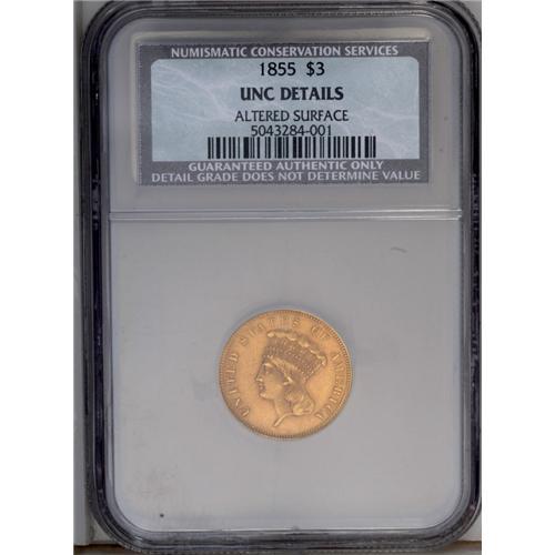 <B>1855<$3>--Altered Surface--NCS. Uncirculated Details.</B></I> This piece is nearly devoid of luster due to some sort of sandblasting or pickling process. Otherwise, nicely detailed without wear.