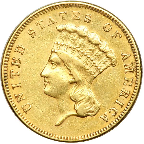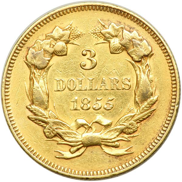 1855 $3 Gold. EF-40. Lightly cleaned at one time.