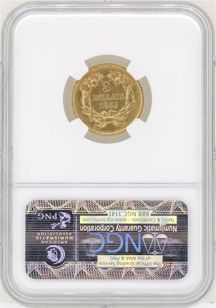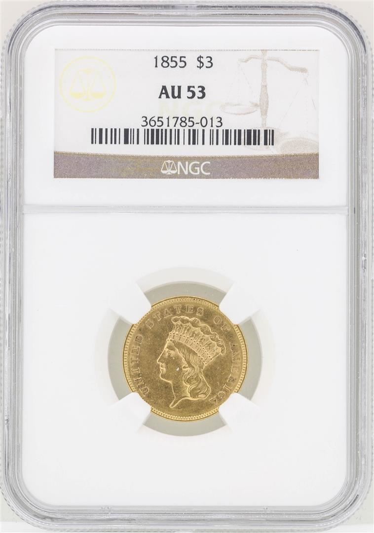 One 1855 $3 Indian Princess Head Gold Coin NGC AU53. NGC Certified.