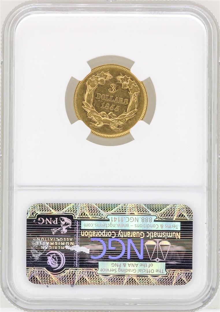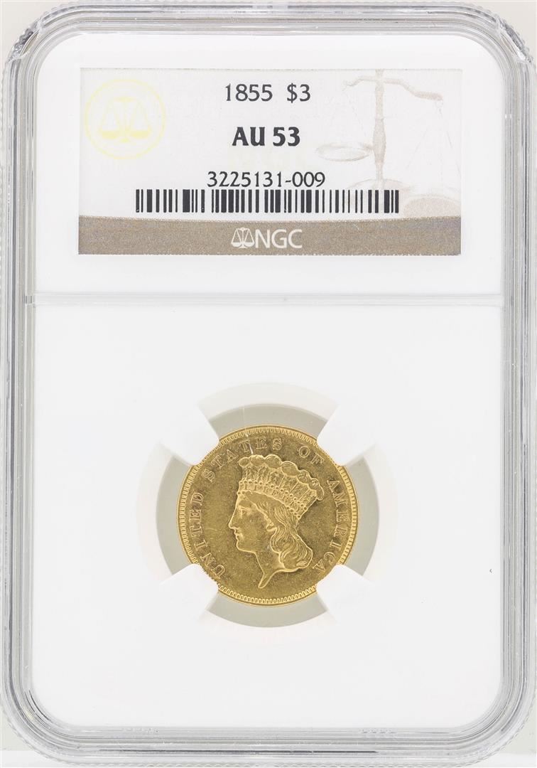 One 1855 $3 Indian Princess Head Gold Coin NGC AU53. NGC Certified.