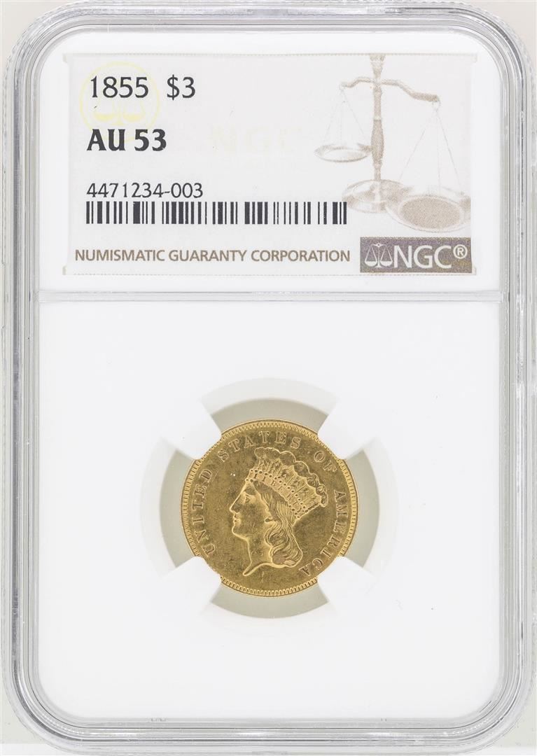 One 1855 $3 Indian Princess Head Gold Coin NGC AU53. NGC Certified.