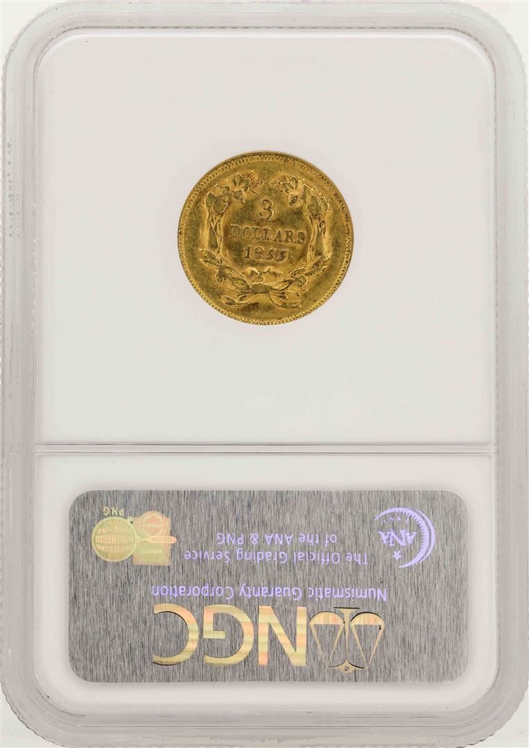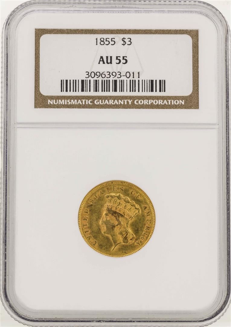 One 1855 $3 Indian Princess Head Gold Coin NGC AU55. NGC Certified.