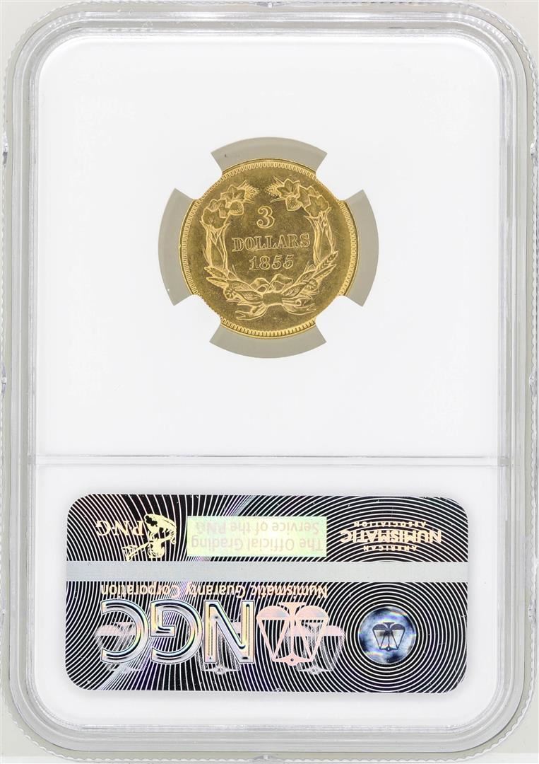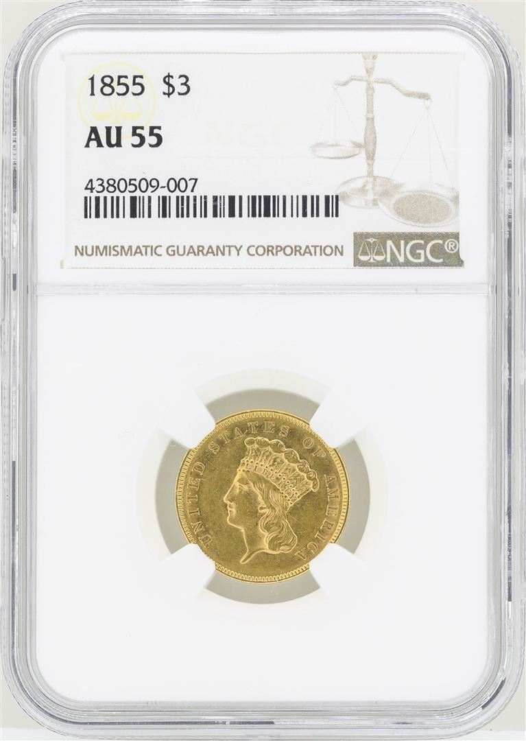 One 1855 $3 Indian Princess Head Gold Coin NGC AU55. NGC Certified.