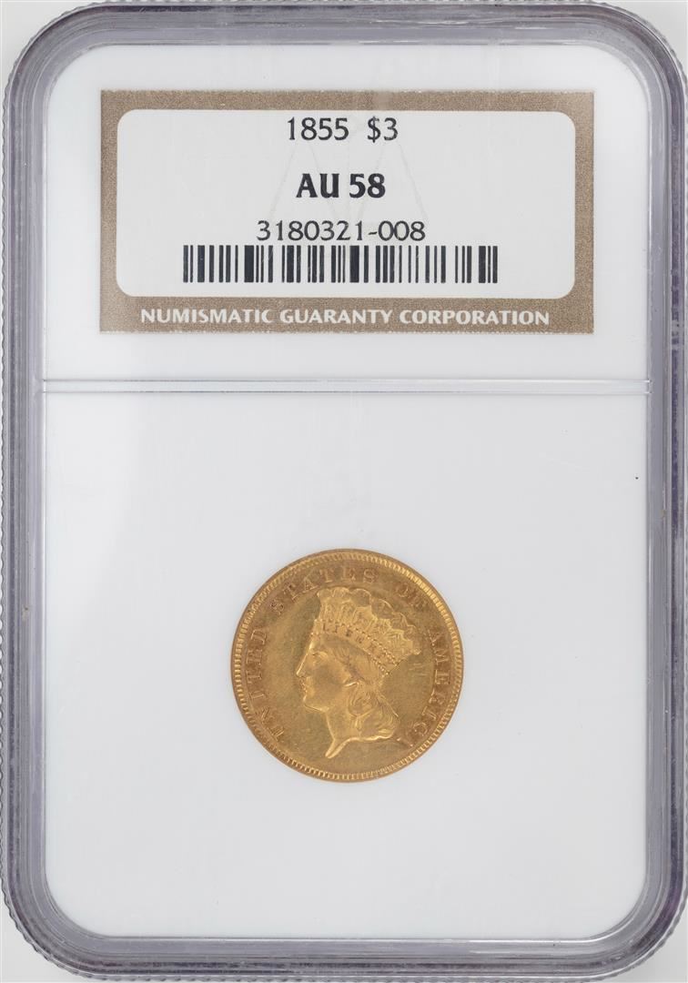 One 1855 $3 Indian Princess Head Gold Coin NGC AU58. NGC Certified.