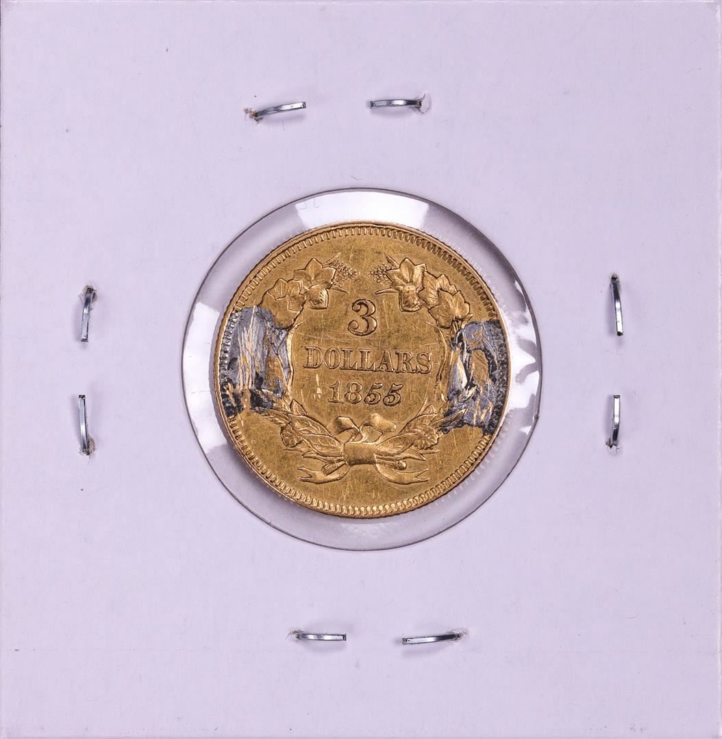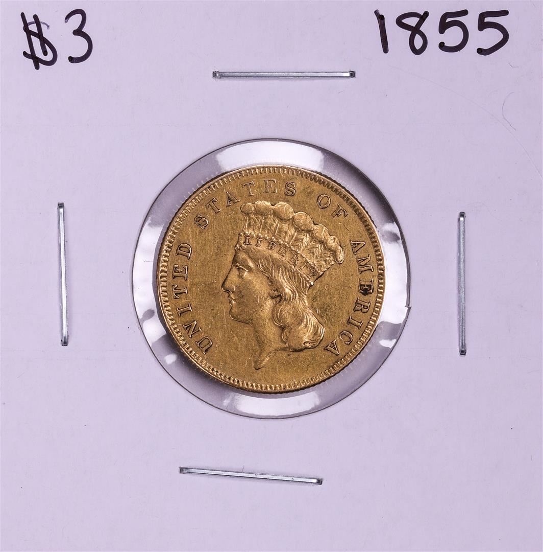 One 1855 $3 Indian Princess Head Gold Coin, please note the reverse does have damage from previously being soldered.