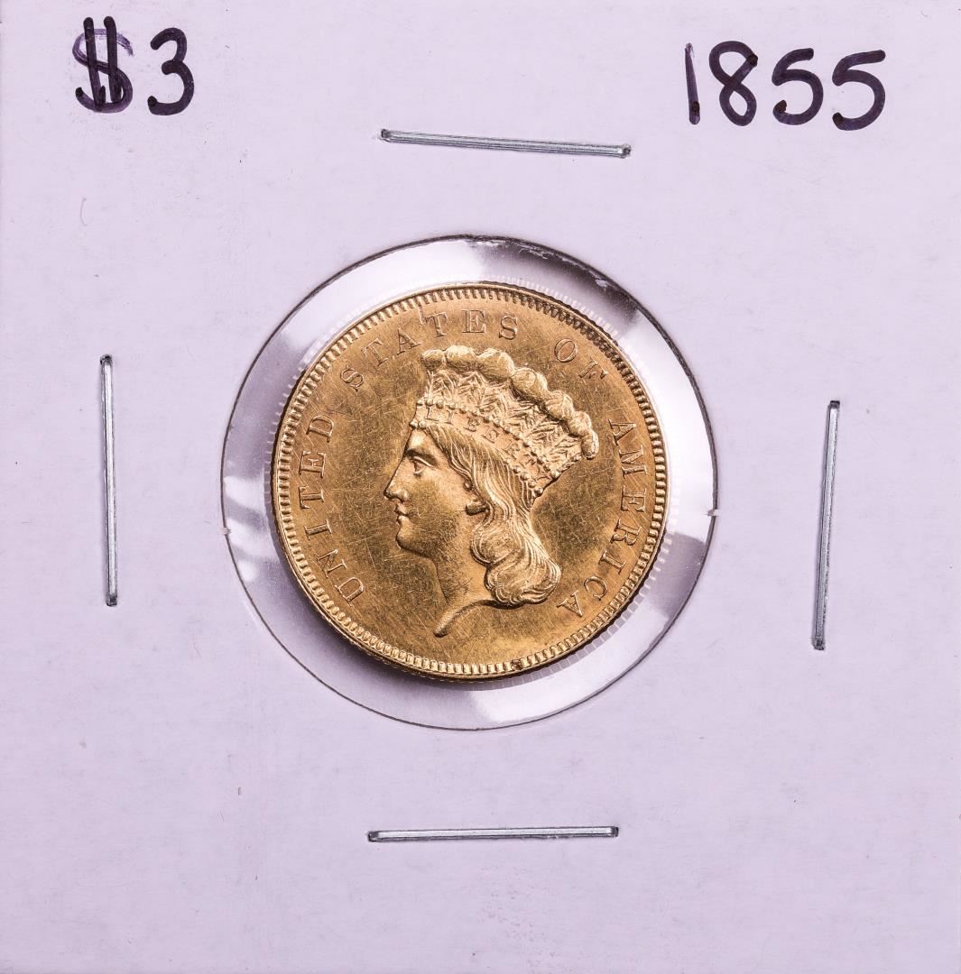 One 1855 $3 Indian Princess Head Gold Coin.