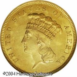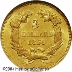 1855 $3 MS62 NGC. Although not a rare date, the 18 <B>1855 $3 MS62 NGC.</B></I> Although not a rare date, the 1855 is scarcer in all grades than the introductory 1854 issue. Unlike Large Cents of the same year, all 1855 Three Dollar Pieces feature a slanted 5 logotype. A sharply struck representative with apricot-gold color. The upper obverse has a couple of faint slide marks, but the surfaces are otherwise relatively unabraded. <BR><BR><B>Important notice:</B> Heritage usually auctions material at the rate of 200-250 lots per hour. On some occasions eBay Live bid software or the Internet may not be able to keep up with the pace of the auction. We recommend placing a realistic absentee bid now as insurance to avoid disappointment. Occasionally the auctioneer may eliminate or reject an eBay Live bid, and the auctioneer may also reopen a lot after the close of the eBay live bidding (usually because we missed an audience bid), and may reject your bid even if it shows you as the winning bidder. By bidding via eBay Live, you agree that Heritage may award the lot to another bidder at its sole discretion under the circumstances described above or any other reasonable circumstances. Since eBay bids are not shown to us until we open the lot on the floor, we treat those bids just like floor bids. In most cases the floor responds before the eBay bid is presented to us, due to Internet lag time, so for consistency we have made it a policy that floor bids are always considered first over tie eBay live bids. Also please note that all Heritage lots purchased through eBay Live carry a 20% Buyer's Premium. Please make sure you read the Terms and Conditions before you bid. This lot is being auctioned in conjunction with a live floor auction by Heritage Galleries & Auctioneers. All final auction and invoice information will be supplied by Heritage Galleries & Auctioneers, and all other information should be considered preliminary. Lot:6599