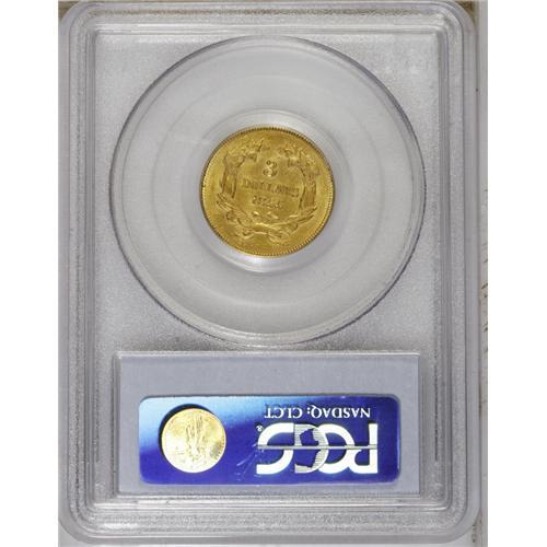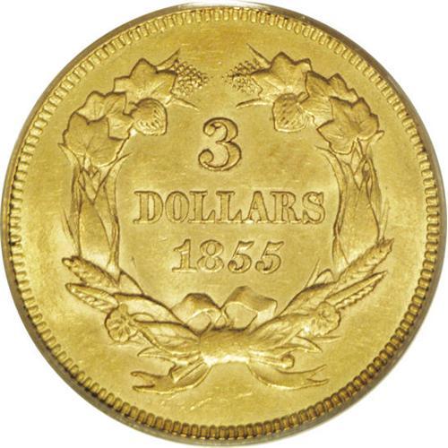 <B>1855 $3 MS62 PCGS.</B></I> Mintage of the 1855 issue was less than half of the 1854 Philadelphia issue, and while the San Francisco Mint produced a smattering of pieces, neither the New Orleans nor Dahlonega mints participated. This example offers enticing apricot-gold surfaces that reveal tiny abrasions under a loupe, none distracting or easily visible save for a small tick on Liberty's chin and one beneath the bowknot. Appealing for the grade, this coin also shows a decent if less than full strike. Population: 57 in 62, 61 finer (12/06).<BR><BR><b>Shipping:</b> Coin/Currency (<a target="_blank" href="http://www.heritageauctions.com/common/shipping.php">view shipping information</a>)