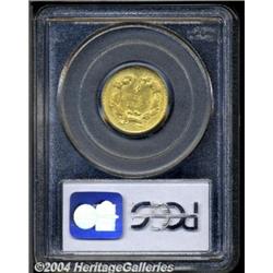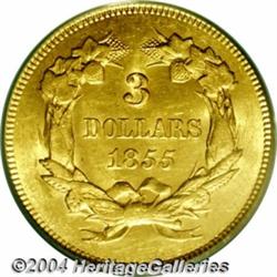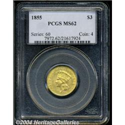 <B>1855<$3> MS62 PCGS.</B></I> First-year of the large reverse letters design. The first examples of this denomination had much smaller letters in DOLLAR. A pleasing and important Mint State example with frosty yellow-gold surfaces. Softly defined on the high points, especially on the reverse. A few fine scratches and other minor abrasions are noted, including an abrasion above Miss Liberty's eye. <BR><BR><B>Important notice:</B> Heritage usually auctions material at the rate of 200-250 lots per hour. On some occasions eBay Live bid software or the Internet may not be able to keep up with the pace of the auction. We recommend placing a realistic absentee bid now as insurance to avoid disappointment. Occasionally the auctioneer may eliminate or reject an eBay Live bid, and the auctioneer may also reopen a lot after the close of the eBay live bidding (usually because we missed an audience bid), and may reject your bid even if it shows you as the winning bidder. By bidding via eBay Live, you agree that Heritage may award the lot to another bidder at its sole discretion under the circumstances described above or any other reasonable circumstances. Since eBay bids are not shown to us until we open the lot on the floor, we treat those bids just like floor bids. In most cases the floor responds before the eBay bid is presented to us, due to Internet lag time, so for consistency we have made it a policy that floor bids are always considered first over tie eBay live bids. Also please note that all Heritage lots purchased through eBay Live carry a 20% Buyer's Premium. Please make sure you read the Terms and Conditions before you bid. </span></font></tr></table></td></tr></table>
