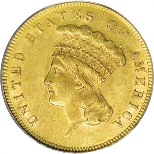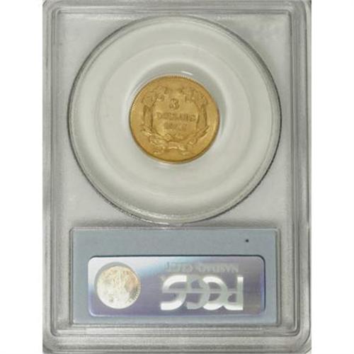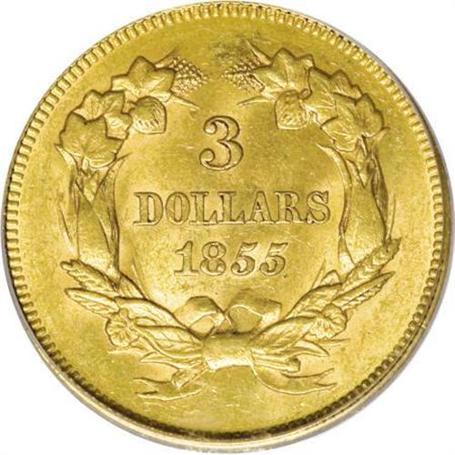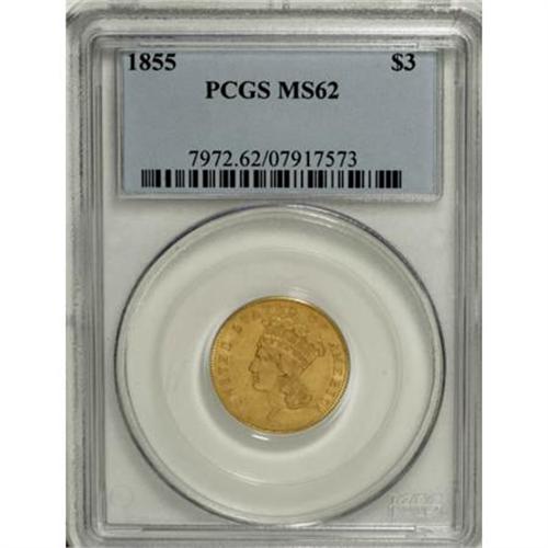 <B>1855 $3 MS62 PCGS.</B></I> The 50,555 pieces struck for this second-year issue were a steep drop from the mintages the previous year, and though the three dollar denomination subsisted for 35 years, it never played an active role in America's economy. This lovely example is unworn with subtly lustrous yellow-gold surfaces. The obverse is lightly abraded, but the reverse is more appealing with less frequent marks. Both sides exhibit a typical strike with generally strong details, although the ribbon bow is rather indistinct.<BR><BR><B>Coin Engraver:</B> James B. Longacre<BR><BR><b>Shipping:</b> Coins & Currency (<a target="_blank" href="http://www.heritageauctions.com/common/shipping.php">view shipping information</a>\)