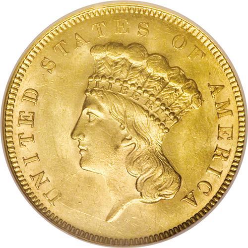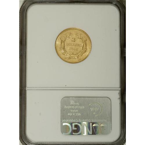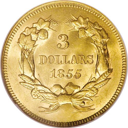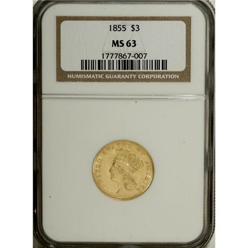 <B>1855 $3 MS63 NGC.</B></I> The 1855 gold dollar is relatively available in Extremely Fine through the lower grades of Uncirculated. Select examples are somewhat elusive, near-Gems are quite scarce, and anything finer is rare. Both sides of this MS63 specimen are awash in potent luster and pleasing yellow-gold color, and a well executed strike left exquisite definition on the design elements. Inoffensive handling marks prevent an even higher grade.<BR><BR><b>Shipping:</b> Coins & Currency (<a target="_blank" href="http://www.heritageauctions.com/common/shipping.php">view shipping information</a>)