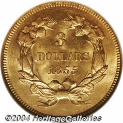 <table><tr><td><table><tr><td>1855 $3 MS63 NGC. The 1855 is one of the more frequently encountered dates in the three dollar series; and yet, when its mintage of 50,555 pieces is set within the overall context of 19th century numismatics, it appears to be an underrated and scarce issue. This is an especially pleasing example. The surfaces are remarkably clean with no mentionable abrasions. Exceptional quality and eye appeal. <BR><BR><B>Important notice:</B> Heritage usually auctions material at the rate of 200-250 lots per hour. On some occasions eBay Live bid software or the Internet may not be able to keep up with the pace of the auction. We recommend placing a realistic absentee bid now as insurance to avoid disappointment. Occasionally the auctioneer may eliminate or reject an eBay Live bid, and the auctioneer may also reopen a lot after the close of the eBay live bidding (usually because we missed an audience bid), and may reject your bid even if it shows you as the winning bidder. By bidding via eBay Live, you agree that Heritage may award the lot to another bidder at its sole discretion under the circumstances described above or any other reasonable circumstances. Since eBay bids are not shown to us until we open the lot on the floor, we treat those bids just like floor bids. In most cases the floor responds before the eBay bid is presented to us, due to Internet lag time, so for consistency we have made it a policy that floor bids are always considered first over tie eBay live bids. Also please note that all Heritage lots purchased through eBay Live carry a 20% Buyer's Premium. Please make sure you read the Terms and Conditions before you bid. <BR><BR><B>IMPORTANT ANNOUNCEMENT ABOUT RESERVES:</B> Heritage now divulges all reserves on its web site 7 days before every auction. If you want to know whether the reserve on this lot has been met, and if not, what the reserve amount is, please visit this lot page on the HeritageCoin.com web site, or email: bid@HeritageGalleries.com </span></font></td></tr></table></td></tr></table>