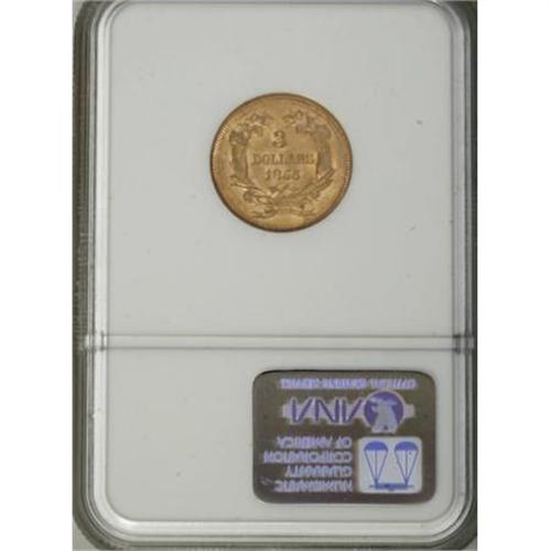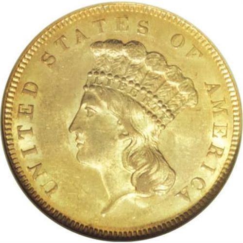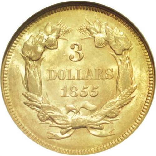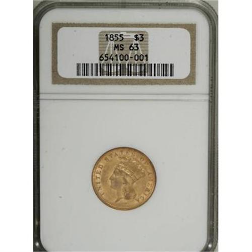 <B>1855 $3 MS63 NGC.</B></I> The slanting 5s of the date, a favorite of Mint Chief Engraver James B. Longacre, add to the charm of this issue. The present example offers lustrous deep orange-gold coloration with a touch of field chatter. A delightful coin for the grade. Census: 44 in 63, 24 finer (1/08).<BR><BR><B>Coin Engraver:</B> James B. Longacre<BR><BR><b>Shipping:</b> Coins & Currency (<a target="_blank" href="http://www.heritageauctions.com/common/shipping.php">view shipping information</a>)