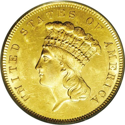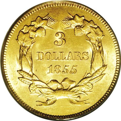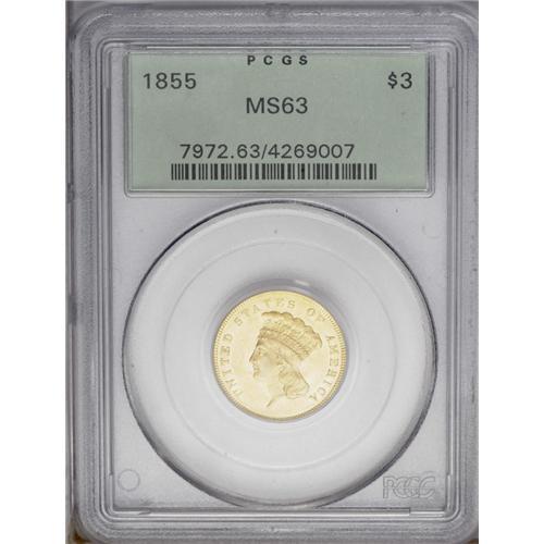 <B>1855<$3> MS63 PCGS.</B></I> The 1855 is one of the more easily obtainable three dollar gold pieces in About Uncirculated and low Mint State grades. However, at the MS 63-65 levels, this issue is undeniably rare when viewed in the larger context of U.S. numismatics, but examples appear with more frequency than other early P-mint dates such as the 1856 and 1857. On the other hand, we suggest that specialists who desire the ultimate representation of either the three gold piece or, in particular, the 1855, enter solid bids when the present Gem crosses the auction block. The surfaces of this specimen are intensely lustrous with a thick coating of mint frost. The color is yellow-gold in shade with copper-golden hues in evidence at certain angles. Both sides are sharply struck and typically abrasion-free for the grade. Population: 44 in 63, 18 finer (4/06).
