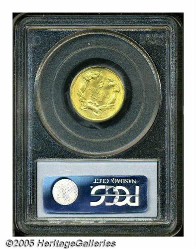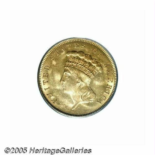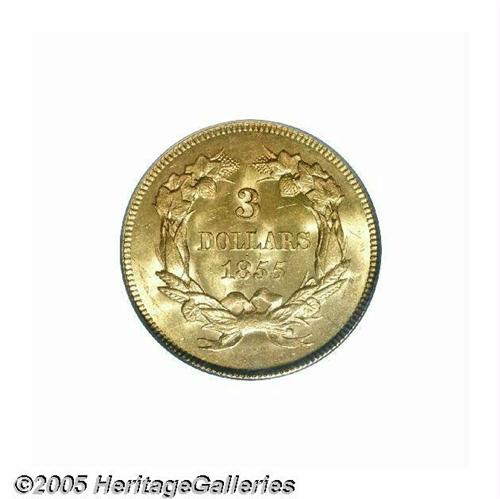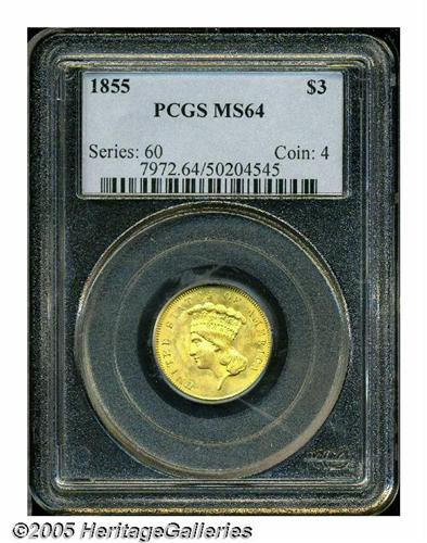 <B>1855<$3> MS64 PCGS.</B></I> The 1855 is one of the more available of the early date Threes. However, when contrasted to a truly common date, such as the 1854, one immediately notes that the mintage of the 1855 is about one-third that of the 1854 and in Mint State it is at least two dozen times rarer. This, of course, is because the 1854 is a first year of issue and was saved as a memento of this unusual denomination. Nowhere near as many 1855s were set aside, and as a result high grade pieces such as this are infrequently encountered. The surfaces of this coin are intensely lustrous with a shimmering quality that overpowers all other attributes the coin possesses. The striking details are not completely brought up, and there are a couple of stray abrasions here and there, but one comes away with an impression of overpowering luster and originality. Population: 15 in 64, 4 finer (5/05).