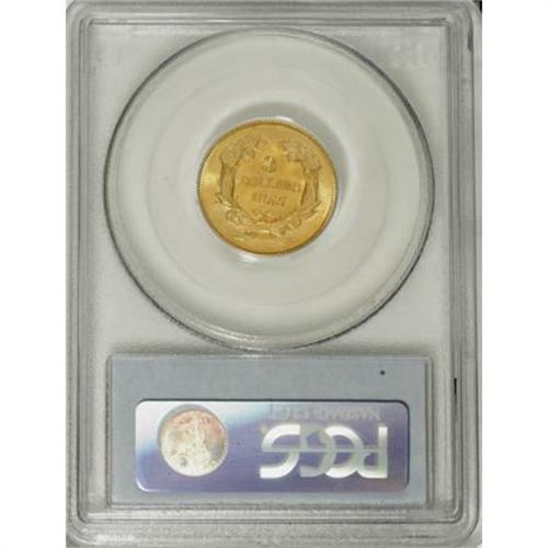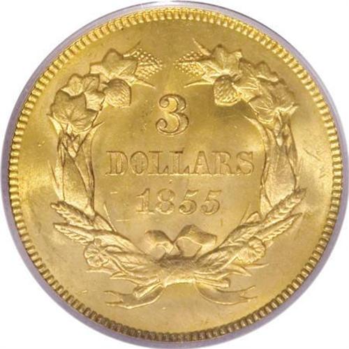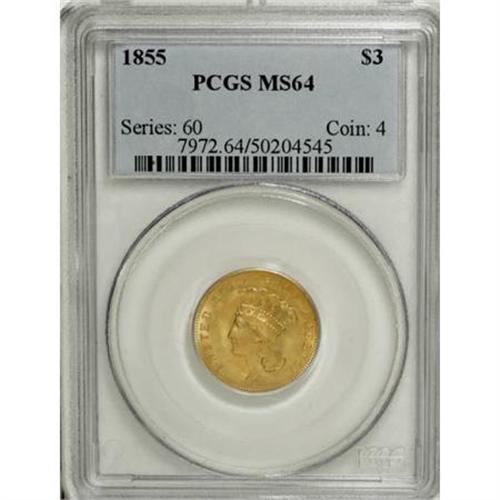 <B>1855 $3 MS64 PCGS.</B></I> The 1855 is one of the more available of the early date Threes. However, when contrasted to a truly common date, such as the 1854, one immediately notes that the mintage of the 1855 is about one-third that of the 1854 and in Mint State it is at least two dozen times rarer. This, of course, is because the 1854 is a first year of issue and was saved as a memento of this unusual denomination. Nowhere near as many 1855s were set aside, and as a result high grade pieces such as this are infrequently encountered.<BR> The surfaces of this near-Gem are intensely lustrous, and possess a greenish-gold coloration. The design elements are generally well impressed, save for the usual softness in some of the hair curls. There are a couple of stray marks here and there, but one comes away with an impression of overpowering luster and originality. Population: 17 in 64, 4 finer (6/07).<BR><I>From The Carlton Woods Collection.</B></I><BR><BR><B>Coin Engraver:</B> James B. Longacre<BR><BR><b>Shipping:</b> Coins & Currency (<a target="_blank" href="http://www.heritageauctions.com/common/shipping.php">view shipping information</a>\)