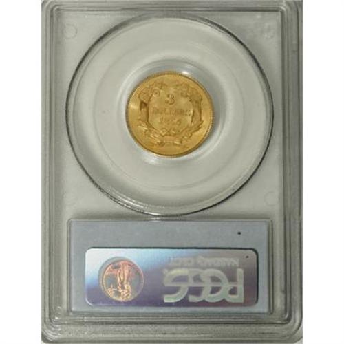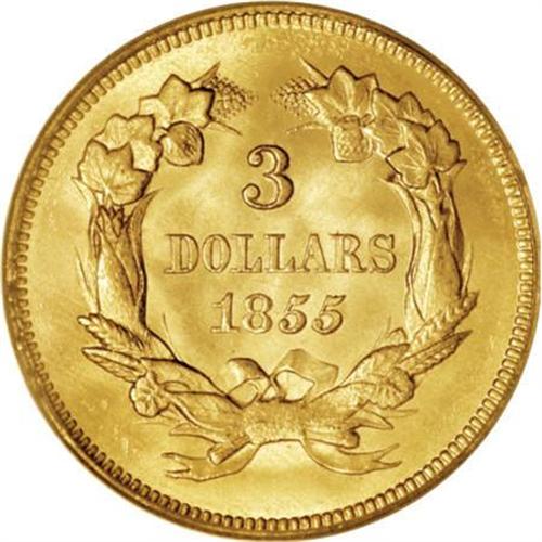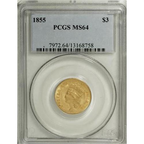 <B>1855 $3 MS64 PCGS.</B></I> The 1855 three dollar, coming off of a mintage of 50, 555 circulation strikes, is available through the MS62 level of preservation. Select examples are more challenging, near-Gems quite scarce, and Gem-quality pieces are extremely rare.<BR> The near-Gem coin presented in this lot displays glowing luster radiating from peach-gold surfaces that are imbued with traces of mint-green. A well executed strike brings out sharp detail on the design features, save for minor softness on the bowknot. A few minor obverse ticks preclude full Gem classification. Population: 17 in 64, 4 finer (8/07).<BR><BR><B>Coin Engraver:</B> James B. Longacre<BR><BR><b>Shipping:</b> Coins & Currency (<a target="_blank" href="http://www.heritageauctions.com/common/shipping.php">view shipping information</a>)