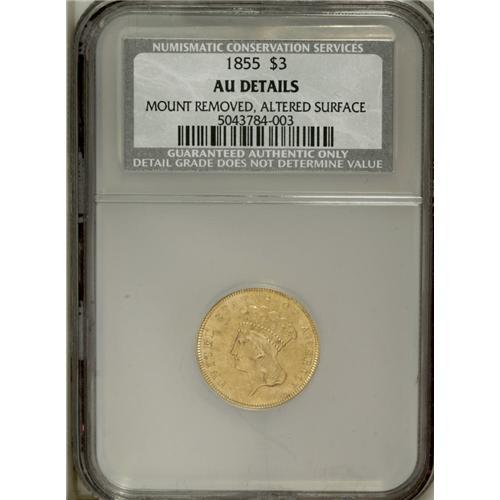 <B>1855 $3 --Mount Removed, Altered Surface--NCS. AU Details.</B></I> This three dollar gold piece is virtually void of wear, and there is no obvious evidence of a former mount. The surfaces are consistently micro-granular, as if the piece has been sandblasted. Still a bold representative of this elusive and popular type.<BR><BR><b>Shipping:</b> Coin/Currency (<a target="_blank" href="http://www.heritageauctions.com/common/shipping.php">view shipping information</a>)