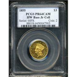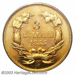<table><tr><td><TABLE cellSpacing=0 cellPadding=0 width="100%" bgColor=#000000 border=0><TBODY> <TR><TD width="100%"><TABLE cellSpacing=1 cellPadding=3 width="100%" border=0><TBODY><TR><TD width="100%" bgColor=#79735c><FONT face=arial color=#ffffff size=3><B>Description</B> </FONT></TD></TR><TR><TD width="100%" bgColor=#ffffff><FONT face=arial size=2><B>1855 $3 PR64 Cameo PCGS.</B></I> An exquisitely struck near-Gem that has imposing cameo contrast and deeply reflective fields. Honey-gold and steel-blue colors alternate across the surfaces. Three very faint pinscratches are noted for pedigree purposes; below the U in UNITED, across the tip of the bust, and across the left end of the ribbon. Proofs of this date are identified by partially effaced JBL initials on the neck truncation, an attenuated leaf to the left of the date, and weakened definition on the ribbon fold inside the right half of the wreath bow, all of which occurred as the dies were polished to provide the proof surface prior to production.<BR>Pre-1859 proof gold coins are extremely rare, and the 1855 Princess is no exception. The actual mintage is unrecorded, as sales to collectors was not an official policy until 1859. As of (9/03), PCGS has certified only three proofs of this date in all grades, one of which is impaired, while the remaining two pieces are graded PR64 and PR64 Cameo (this coin). The other PR64 example is probably either the Trompeter specimen, auctioned in February 1992 by Superior, or the Garrett specimen, sold by Stack's in March 1976. NGC has yet to certify an 1855 proof $3. Certainly, years may pass before another opportunity arrives to acquire a proof 1855 Princess, much less one with the desirable Eliasberg and Bass pedigrees.<BR><I>Ex: William H. Woodin Collection (Thomas L. Elder, 3/1911); John H. Clapp estate, Louis E. Eliasberg, Sr. Collection (Bowers and Ruddy, 10/1982), lot 275, which realized $28,600; Auction '85 (Superior, 7/1985), lot 934, which realized $31,900; Harry W. Bass, Jr. Collection, Part III (Bowers and Merena, 5/2000), lot 271, which realized $62,100.</B></I> </FONT></TD></TR></TBODY></TABLE></TD></TR></TBODY></TABLE><BR><A name=PricesRealized></A><TABLE cellSpacing=0 cellPadding=0 width="100%" bgColor=#000000 border=0><TBODY><TR><TD width="100%"><TABLE cellSpacing=1 cellPadding=3 width="100%" border=0><TBODY><TR><TD width="100%" bgColor=#79735c><A name=PR><FONT face=arial color=#ffffff size=3><B>Previous Prices from Heritage Auctions</B> </FONT></A></TD></TR><TR><TD bgColor=#f6f6ed>No Prior Data Recorded </TD></TR><TR><TD bgColor=#ffffff><FONT face=arial size=1 ?>PLEASE NOTE: All prices realized reflect the final hammer price PLUS the buyer's premium in auctions that charge a buyer's premium. Each item has a notation at the top of the listing indicating whether that lot included a buyer's premium. Example: A item that sells with a final hammer price of $100 and a 20% buyer's premium will display with a price realized of $120. All information listed is intended to be as accurate as possible, but errors are possible. Please use this guide carefully and inform us of any inaccuracies. </FONT></TD></TR></TBODY></TABLE></TD></TR></TBODY></TABLE><BR><TABLE cellSpacing=0 cellPadding=0 width="100%" bgColor=#000000 border=0><TBODY><TR><TD width="100%"><TABLE cellSpacing=1 cellPadding=3 width="100%" border=0><TBODY><TR><TD width="100%" bgColor=#79735c colSpan=6><FONT face=arial color=#ffffff size=3><B>Price Guide*</B> </FONT></TD></TR><TR bgColor=#f6f6ed><TD align=middle><B>Grade</B> </TD><TD align=middle><B>Coin World<BR>(Trends)</B> </TD><TD align=middle><B>Numismedia<BR>Retail</B> </TD><TD align=middle><B>Numismedia<BR>Wholesale</B> </TD><TD align=middle><B>Coin<BR>Universe</B> </TD><TD align=middle><B>Heritage<BR>Value Index</B> </TD></TR><TR bgColor=#ffffff><TD align=middle>63</TD><TD align=right>---</TD><TD align=right>---</TD><TD align=right>---</TD><TD align=right>---</TD><TD align=right>$48,726.56</TD></TR><TR style="FONT-WEIGHT: bold" bgColor=#cccfdd><TD align=middle>64</TD><TD align=right>---</TD><TD align=right>---</TD><TD align=right>---</TD><TD align=right>---</TD><TD align=right>$49,500.00</TD></TR><TR bgColor=#ffffff><TD align=middle>65</TD><TD align=right>---</TD><TD align=right>---</TD><TD align=right>---</TD><TD align=right>---</TD><TD align=right>$81,000.00</TD></TR><TR bgColor=#ffffff><TD colSpan=6><FONT size=1>*All information listed is intended to be as accurate as possible, but errors are possible. No item may be returned or refused based on this information which is provided as a service to our customers. You should contact each pricing source directly to determine the accuracy of this information. </FONT></TD></TR></TBODY></TABLE></TD></TR></TBODY></TABLE><BR><TABLE cellSpacing=0 cellPadding=0 width="100%" bgColor=#000000 border=0><TBODY><TR><TD width="100%"><TABLE cellSpacing=1 cellPadding=3 width="100%" border=0><TBODY><TR><TD width="100%" bgColor=#79735c><FONT face=arial color=#ffffff size=3><B>Population Guide</B> </FONT></TD></TR><TR bgColor=#ffffff><TD align=middle><!-- Begin Output of Population Grid--><TABLE cellSpacing=0 cellPadding=0 width="100%" border=0><TBODY><TR><TD vAlign=center><TABLE cellSpacing=0 width="100%" border=1 cellsadding="3"><TBODY><TR><TD vAlign=center><TABLE cellSpacing=0 cellPadding=3 width="100%" border=1><TBODY><TR><TD vAlign=center align=middle bgColor=#f0f1e8 colSpan=2 <CENTER><FONT face=Arial size=2><B>PCGS Pop </B></FONT><CENTER></CENTER></TD><TD vAlign=center align=middle bgColor=#f0f1e8 colSpan=2><CENTER><FONT face=Arial size=2><B>NGC Pop</B></CENTER></FONT></TD></TR><TR><TD vAlign=center><FONT face=Arial size=2>(64)</FONT> </TD><TD vAlign=center align=right><FONT face=Arial size=2>1</FONT> </TD><TD vAlign=center><FONT face=Arial size=2>(64)</FONT> </TD><TD vAlign=center align=right><FONT face=Arial size=2>0</FONT> </TD></TR><TR><TD vAlign=center><FONT face=Arial size=2>(>64)</FONT> </TD><TD vAlign=center align=right><FONT fac