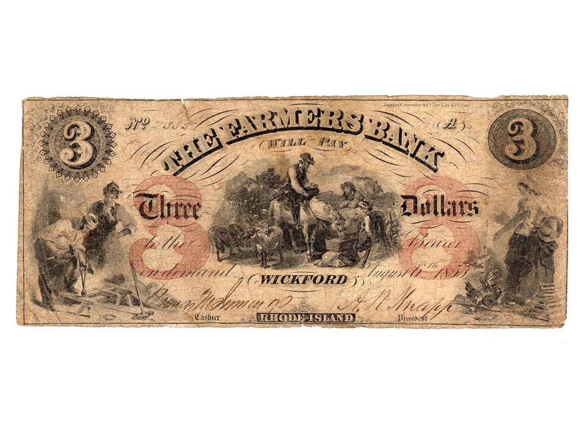 One 1855 $3 The Farmers Bank Obsolete Bank Note.