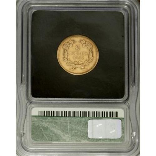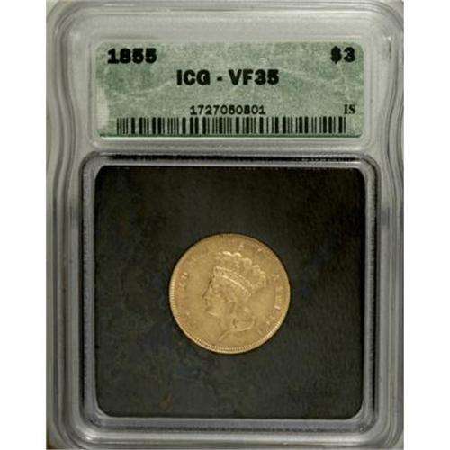 <B>1855 $3 VF35 ICG.</B></I> This Choice VF example displays moderate, even wear with faint, tiny marks and hairlines on each side. A pleasing coin from the second year of this popular gold denomination. <BR><BR><B>Coin Engraver:</B> James B. Longacre<BR><BR><b>Shipping:</b> Coins & Currency (<a target="_blank" href="http://www.heritageauctions.com/common/shipping.php">view shipping information</a>)