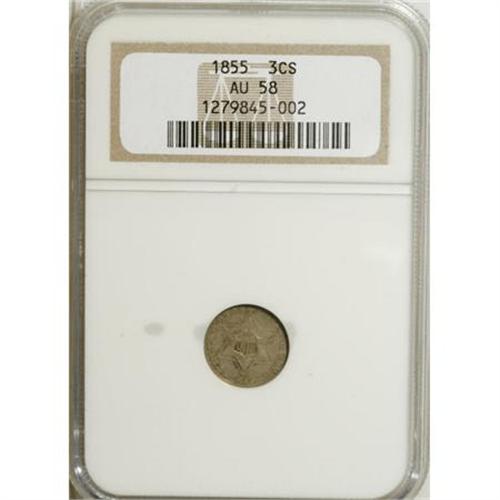 1855 3CS AU58 NGC. NGC Census: (11/72). PCGS Popul