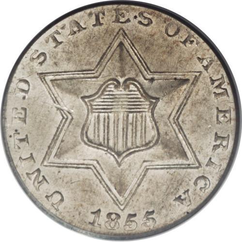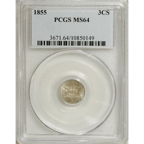 <B>1855 3CS MS64 PCGS.</B></I> In 1854, the silver three cent piece design was altered slightly through the placement of three lines around the obverse star. David Bowers, in his 1988 <I>Action Guide,</B></I> says; "Of all three types of the silver three-cent denomination, the 1854-1858 style is the most difficult to locate. Few Uncirculated pieces were saved at the time of issue, so pieces in Mint State are quite rare today." This near-Gem specimen displays light silver-gray surfaces with pleasing luster. While the reverse star centers reveal the characteristic flatness of this issue, the remaining design elements exhibit much better-than-average definition. The points of the obverse star are sharp, and most of the ribbing in the reverse leaves is clear. A linear mark on the left border of the obverse central device precludes the Gem designation. Population: 36 in 64, 14 finer (3/07).<BR><BR><b>Shipping:</b> Coins & Currency (<a target="_blank" href="http://www.heritageauctions.com/common/shipping.php">view shipping information</a>)