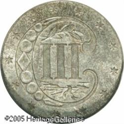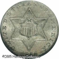 <B>1855 3CS MS65 NGC.</B></I> Type Two Three Cent Silver pieces (1854-1858) are by far the most challenging design of the series, particularly in better Mint State grades. The 1855 is a low mintage issue also with only 139,000 pieces produced. This is a lustrous Gem that shows pale blue toning on the obverse with a golden-rose coloration over the reverse. Fully struck, and quite unusual as such, with light die clashing seen on each side, a common occurrence on this diminutive type. Population: 7 in 65, 6 finer (1/05). Lot:5649