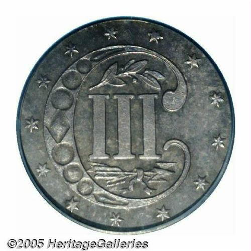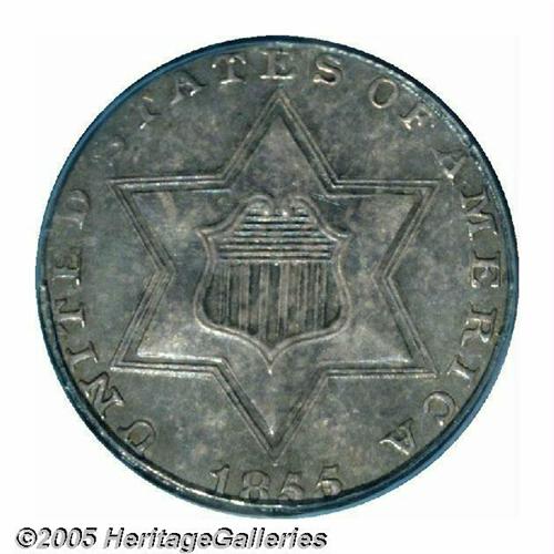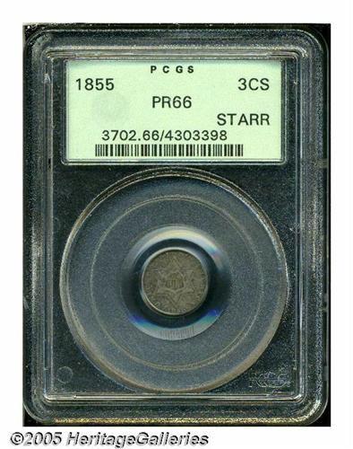 <B>1855<3CS> PR66 PCGS.</B></I> A beautifully preserved specimen that was struck from the same pair of dies used to produce most of the 139,000 business strikes from this year. The final three digits of the date are double punched, bold evidence of which can be seen under a loupe. The surfaces exhibit a subtle degree of glassy brilliance under mottled mottle gunmetal, apricot, and steel-blue patina. When viewed at a slight angle the coin's reflectivity is unmistakable. Produced before the Mint began widespread sales of proofs to collectors, the 1855 is a rare issue with no more than 30 pieces (Breen, 1977) believed extant. Population: 2 in 66, 0 finer (4/05).<BR><I>From The Western Hills Collection.</B></I>