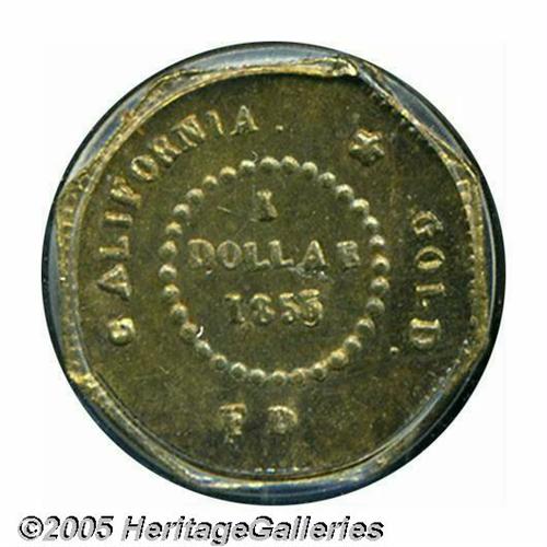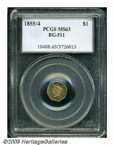 <B>1855/4<$1> Liberty Octagonal 1 Dollar, BG-511, High R.4, MS63 PCGS.</B></I> Dark steel and iridescent toning with wisps of yellow-gold shining through. California Fractional Gold Dollars from the first period are highly desired by specialists. We expect this example to see considerable bidding activity.